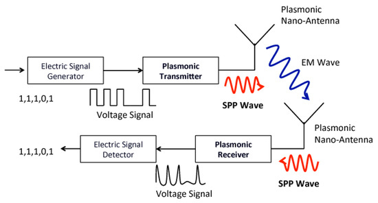 In general, as known, a transceiver is a set of components which is responsible for generating and modulating the outgoing information to the antenna, via appropriate transmitters at the front end of the nanolink, and also responsible for detecting the incoming from the antenna information via appropriate receivers at the back end of the nanolink. A block diagram of a typical plasmonic transceiver architecture is seen in Figure 16 [102]. Apart from the basic transceiver components, namely, the signal generator, the transmitter which is normally a modulator source, and the detector-receiver, there may be other components acting complementary, in order to propagate the information signal across the link with the minimum loss, such as interconnects, switches, filters, high tunability phase shifters, mixers, frequency multipliers, and impedance matched elements, placed between the antenna and the waveguide of the link. As can be seen from Figure 16, at the front end, there is an electric signal generator that generates the electric signal that will later on, feed the transmitter source. Then the outgoing signal, which in our case of plasmonic THz sources is normally a modulated SPP wave, is feeding the plasmonic nanoantenna, which converts the SPP wave into an EM wave. At the receiver end, there is another plasmonic nanoantenna with a similar role, that inversely converts the EM wave again into an SPP wave. Finally, a plasmonic nanoreceiver converts the SPP wave into an electric signal, which will be demodulated to the original information data by the signal detector [102].