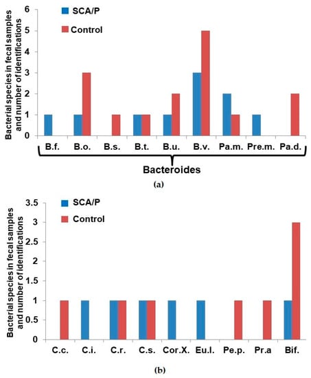 As far as the Gram+ bacteria identified in the two group of subjects (Figure 1), similarly to what observed in Gram− bacteria, specific bacterial species were found in the two groups: Clostridium clostridioforme (C.c.), Propionibacterium avidum (Pr.a.) and Pedioccus pentasaceus (Pe.p) were identified in control group only, while Eubacterium limosum (Eu.l.), Clostridium innocuum (C.i.) and Corynebacterium xerosus (Cor.x.) were identified in SCA/P feces only.