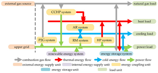 The electric–gas interconnection system consists of the natural gas system, the heating system, the cooling system and the power system distributed in the same area. The system components can be divided into external energy supply unit, internal energy supply unit, energy coupling unit, energy storage unit, energy supply network and load unit. The typical structure of the electric–gas interconnection system is shown in Figure 1, and the return water network for cooling and heating is not shown in this figure.
