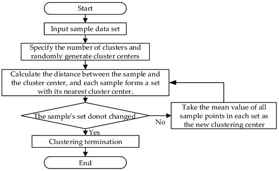 First of all, according to the historical data of clearing price in the power market and the natural gas market, a specific probability distribution can be obtained by data fitting. Then, a large number of scenes are obtained by sampling. The larger the number of scenes are, the more accurate the results are, but the larger the calculation amount is. In order to balance the calculation amount and accuracy, firstly, according to the probability distribution of market clearing price, a large number of scenarios are generated by Latin hypercube sampling (LHS). Then, the k-means algorithm is used to reduce and merge the scene, and the probability of the scene after merging is calculated. The flow of the k-means algorithm is shown in the Figure 3.