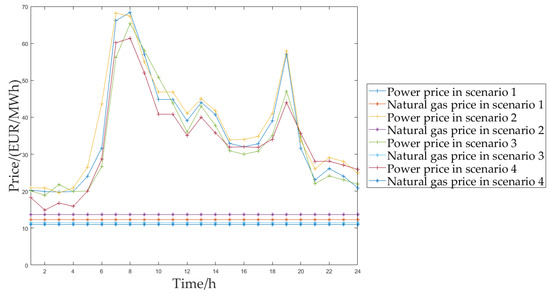 In order to simplify the model, the following assumptions are made: the daily clearing prices of the power market and the natural gas market in each period meet the normal distribution in a certain range; the mean value is taken from the actual market data of European energy exchange (EEX) and Nord pool, respectively; and the standard deviation is 3 EUR/MWh. Under the above data settings, 1000 daily clearing price scenarios of the natural gas market and the power market are generated respectively through LHS. After reduction, typical daily clearing price scenarios are obtained. The penalty price is set as 50% of the daily clearing price of the day-ahead market. The price data of typical daily clearing price scenarios are shown in Figure 4, the specific price data can be found in Supplementary Materials.
