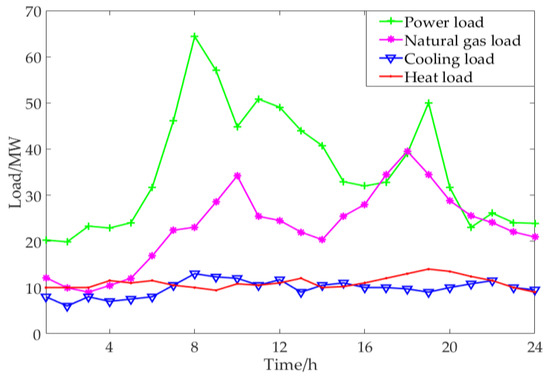 The structure of the electric–gas interconnection system in the example analysis of this paper is shown in Figure 1, the specific load data can be seen in Supplementary Materials. The load data of power, heat, cooling and natural gas in the calculation example is shown in Figure 5. The conversion efficiency and the upper and lower limits of each coupling unit output power are shown in Table 1.