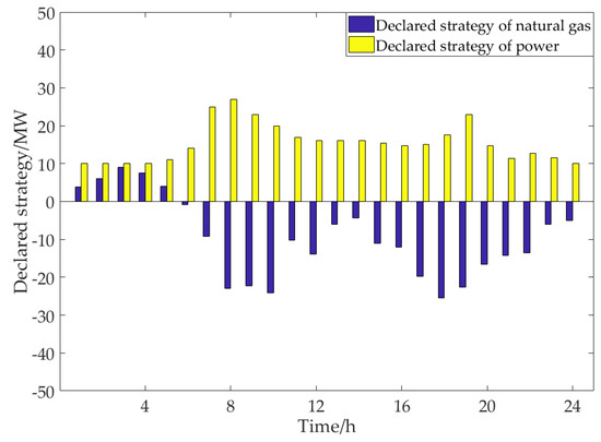 In order to verify the feasibility of the model and algorithm, this paper uses Matlab R2017a to compile the model mentioned above, and carries out trial calculation, the specific MATLAB code can be seen in Supplementary Materials When = 6, the declared strategy and the optimal output power of each unit of the electric–gas interconnection system in the natural gas market and the power market in each period can be obtained, as shown in Figure 6, Figure 7 and Figure 8.