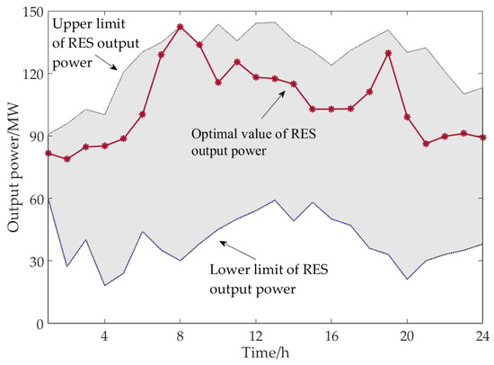 The uncontrollable component is the RE system, and the output power of electric energy in the system comes from the renewable energy units. After the output power of some renewable energy units is converted into other energy forms or supplies power to the coupling units, the remaining part is the declared value of the output power of electric energy in the system for bidding. Therefore, the optimal output power of the renewable energy units is actually the output power of the renewable energy unit ensuring the optimal purchase and sale strategy of the system, and it is not the actual output of the next day. If the decision-makers declare according to the declared strategy of energy purchase and sale corresponding to the optimal output power of the renewable energy units, the deviation of system output power will be minimized and the income will be maximized. In Figure 7, the upper and lower curves respectively correspond to the upper and lower limits of the RES output power in the system, and this value can be predicted according to the historical actual data. The shaded part is the predicted confidence interval of the RES output power within 24 h. The red curve in the middle represents the optimized RES output power strategy. It can be seen that the output power decision of RES at all times is within the confidence interval of the RES output power within 24 h, and the optimal value of the RES output power in the periods 8–9 is the upper limit value of allowable output power. According to Figure 4, Figure 5 and Figure 6, there are two factors that influence the optimal output to reach the upper limit: one is that the system power load is at the peak in the periods 8–9; the other is that the power price is at the peak in the periods 8–9. On the basis of meeting the internal energy demand, the system decision-makers sell power to the power market with the maximum capacity due to the profit seeking mentality.