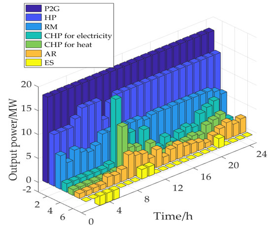 In the above scenario, the output power of energy coupling unit and energy storage unit in each period of the electric–gas interconnection system is as shown in Figure 8. It can be seen from the figure that P2G equipment is in full load state all day, HP and RM are in full load state except for some periods, CHP and AR fail to reach 50% of the rated power rate in most of the periods and stay in auxiliary state, and ES is charged in the periods 3–5 and discharged in the periods 9–10 and 20.