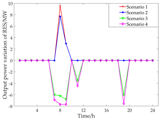 It can be seen from the table that the expected profit generated by the system participating in the market bidding is positively related to the change of the upper limit of RES output power, and when the upper limit of RES output power changes in a negative direction, the change range of the expected profit is larger. When the upper limit of RES output power changes positively, only the optimal output power of RES in periods 8 and 9 changes (as shown in Figure 9), and when the upper limit of RES output power changes negatively, the optimal output power of RES in the periods 7–9, 11 and 19 changes simultaneously (as shown in Figure 9). Compared with the positive change, the negative change of the upper limit of RES output power is more significant, which is one of the reasons why the expected profit is more sensitive to the negative change of RES output power.