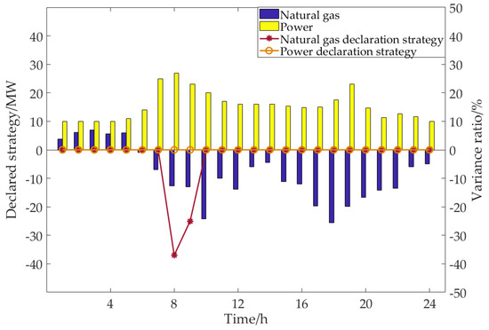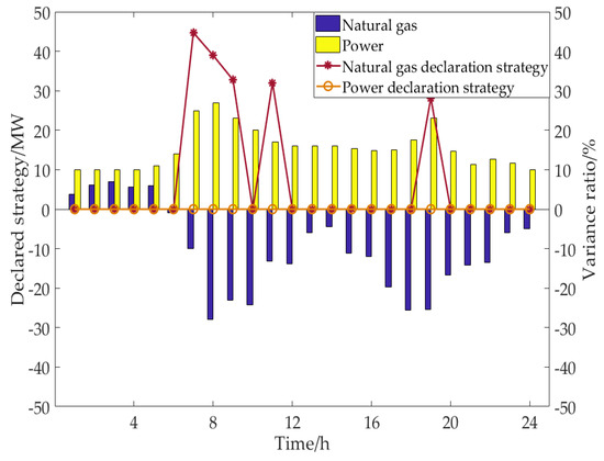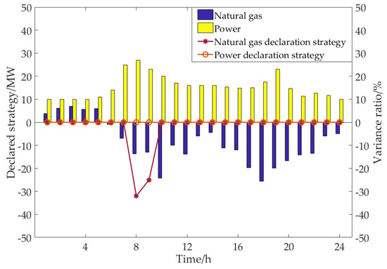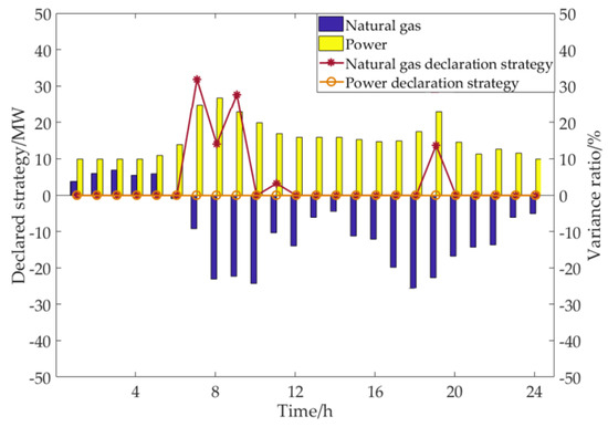 Figure 10, Figure 11, Figure 12 and Figure 13 show the bidding strategy of the electric–gas interconnection system in four scenarios and the variance ratio of the declared strategy in each period compared with the control scenario. It can be seen from the figure that under the parameter setting in this paper, when the upper limit of the internal power supply unit output changes, the internal power supply unit output changes correspondingly, but the power declared strategy does not change. Considering that the power transaction price is more advantageous than the natural gas transaction price, the system decision-makers are more inclined to reduce the natural gas declaration volume in periods 8–9 on the premise of meeting the internal load demand, so as to ensure the optimal declared strategy of energy purchase and sale. In scenario 1 and scenario 2, the power consumption of internal energy supply units is promoted by reducing the purchase of natural gas in general, and the power generation consumption of the internal energy supply unit is reduced more in the 8th period when the natural gas purchase amount is relatively large, which directly leads to the increase of expected profits. In scenario 3 and scenario 4, the power generation reduction of the internal energy supply unit is generally compensated by increasing the purchase of natural gas, and the purchase of natural gas increases substantially in the periods 7–9 and 19, which also directly leads to the reduction of expected profits.