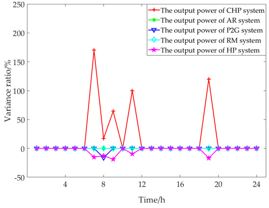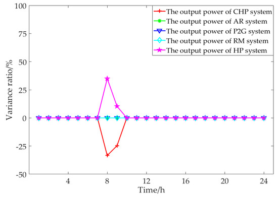 Figure 14, Figure 15, Figure 16 and Figure 17 show the output variation ratio of the internal coupling unit in each period of the electric–gas interconnection system compared with the control scenario. It can be seen from the figure that under the parameter settings in this paper, when the upper limit of the output of the internal power supply unit in the electric–gas interconnection system changes, the output of the internal power supply unit changes correspondingly, the output of AR, P2G, RM does not change, and the output of HP and CHP changes correspondingly. In scenario 1 and scenario 2, the output of HP increases in periods 8 and 9, and the change proportion is positively related to the upper limit change of power supply unit’s output. The reason for the change is that the RES output increases in periods 8 and 9, the power declared strategy remains unchanged, and the natural gas purchase volume is reduced. When the natural gas flow and electric energy flow change, HP and CHP will change their output correspondingly to maintain the stability of heat energy flow. In scenario 3 and scenario 4, due to the increase of gas purchase volume in some time periods, CHP and HP increase or decrease their output respectively in corresponding time periods to maintain the supply-demand balance of the system. In particular, the P2G output decreases in the eighth period, and the reason is that in the controlled situation CHP output has been close to the upper limit of output in the eighth period and the increased amplitude is compressed, so P2G needs to be called to maintain the balance of supply and demand in the system.