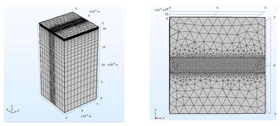 Figure 1 shows a finite element model for laser cleaning. To replicate the actual materials, the model was made of an LY12 aluminum alloy substrate measuring 1 mm × 1 mm × 2 mm, an oxide layer with thickness of 7 μm, and a 50 μm polyacrylate resin base paint layer. The moving pulse laser scans the sample in a single pass in the positive direction along the X-axis. The paint layer directly absorbs the laser energy during the cleaning process, and heat is thermally transferred to the oxide layer and the surface of the substrate. By referring to the pre-experiment and experimental equipment conditions, a simulation calculation was carried out using a set of parameters with a fixed wavelength of 1064 nm, pulse width 1 μs, energy density 17.26 J/cm2, spot diameter 78 μm, laser repetition frequency 20 kHz, and scanning speed 600 mm/s.