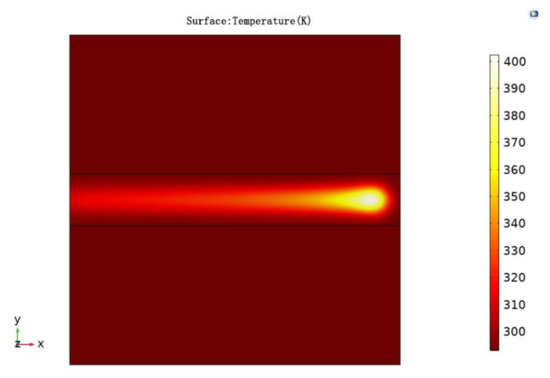 Figure 3 shows the dynamic change in temperature field distribution of the model during the laser cleaning process. The pulsed laser heat source moved at a speed of 600 mm/s in the X direction, and temperature field distribution appeared as a comet with a tail. The temperature in the center of the pulsed spot was the highest, the edge gradually decreased, and the temperature field conformed to a Gaussian distribution. The uncooled temperature field that was formed by the previous pulse remained on the scanning path. The reason for this is that the temperature field formed by each pulse was connected at a certain overlap rate.