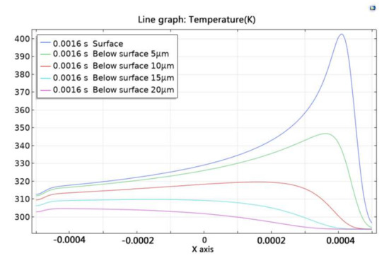 Figure 4 shows the temperature change curve at different positions in the x-axis direction at t = 0.0016 s. It can be seen that temperature change of the material is mainly concentrated near the pulse spot irradiation area during the laser cleaning process. The temperature of the paint below surface 15 μm did not change, which indicated that the depth affected by the laser was about 15 μm. When x < 0.0035, the temperature of the paint at different depths increased, which also indicated that there was overlap in the temperature field formed by each pulse, causing an energy accumulation effect.
