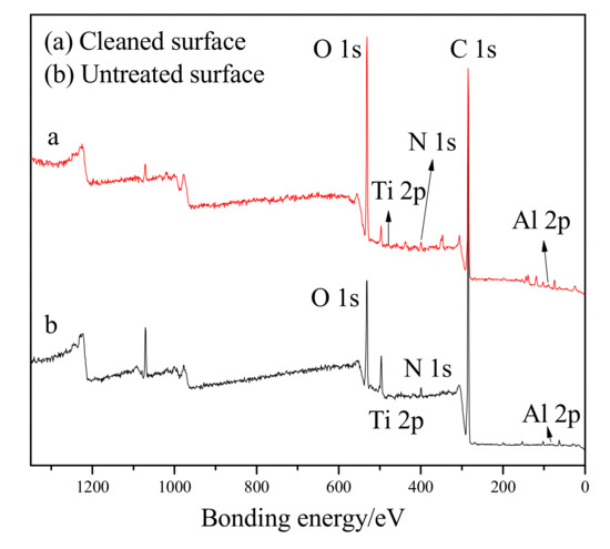 The changes in the surface composition of the paint after laser cleaning were determined by XPS. Figure 7 presents the spectra of (a) the cleaned surface and (b) the untreated surface. Peaks of 1s core level of C, O, N and 2p core level of Ti, Al are clearly visible, and the peaks of C, O, and N were found to have changed significantly before and after the cleaning. The results show that the peaks of C and N in the cleaned surface had decreased, while the peak of O had increased. The reason for this difference is most likely due to the following analysis: The surface of the residual paint layer was no longer smooth, and the surface area had obviously increased. In addition, nanoparticle additives such as TiO2 and Al2O3 were found exposed on the surface. The polymer molecular chain was thermally decomposed and burned by absorbing laser energy, illustrating that the paint had released C and N atoms as simple gas or volatile species of CO and NO2 during the cleaning process. The peaks of C, N were found to be lower on the cleaning surface and the intensity of the peak of O was enhanced. This is probably due to chemical reactions taking place while the pulsed laser was removing the paint.