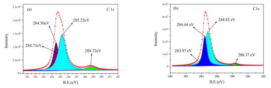 The electronic state and existing forms of C, O, N, Ti, and Al can be further studied by examining the fine spectra of each element on the surface of the paint layer before and after laser cleaning. The profiles of the C1s, O1s, N1s, Ti2p and Al2p spectra on the surface of the paint layer before and after laser cleaning are shown in Figure 8, Figure 9, Figure 10 and Figure 11, respectively.