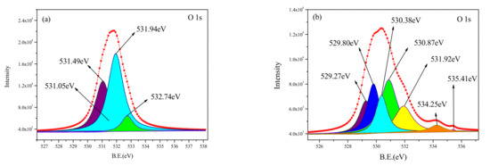 The curve-fitted O1s XPS spectra, obtained from the untreated and cleaned samples, are shown in Figure 9. The components of the O1s spectra for various binding energy values are listed in Table 4. It can be seen from Figure 9b and Table 4 that the O element on the surface of the untreated sample is mainly in the form of metal oxide and oxygen-containing functional group such as O = C, -OH, -COOC-. The relative content of the oxygen-containing functional group is only 17.83%. Compared with the spectra for the untreated surface, the peak of the C1s spectrum obtained from the cleaned sample shows four peaks at 531.05 eV, 531.49 eV, 531.94 eV, and 532.74 eV, respectively. The presence of O element on the surface of the cleaned sample was more complicated. The new metal oxide was found to have complex forms such as TiO1.65, Al2Si2O7, SiO2(Al2O3)0.22, indicating that the nano-added particles in the polymer had complicated physicochemical reactions during the cleaning process. At the same time, some nanoparticles were lost. Two new oxygen-containing functional groups appeared at 531.94 eV, 532.74 eV for the O1s spectra, which were related to the (-CH2C(CH3)(C(O)O(CH2)3CH3)-)n, (-CH2CH(C(O)OH)-)n groups, respectively. The emergence of oxygen-containing functional groups can be because free radicals were generated from the chemical bond and stabilized by oxidation. This demonstrates that after the pulsed laser cleaning, the chemical bonds of C-C, C-O, and C-H in the chemical molecular chains broke and were rearranged. The number of organic molecular chains increased, and the relative content was found to be up to 50%.
