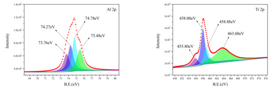 Results of peak separation of the XPS Al2p, Ti2p spectra, together with the binding energy and relative content of the Al2p, Ti2p spectra.