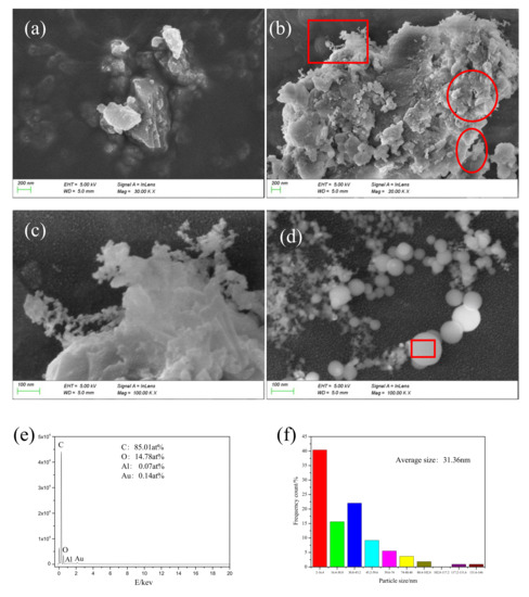 A micrograph of particles collected during the laser cleaning process is shown in Figure 13. Figure 13c is a magnified image of the boxed area in Figure 13b. The collected particles were of different sizes (micrometer, submicron, and nanometer). The nanoparticles were irregular in shape and had uneven edges, as shown in Figure 13a. The circular area, as shown in Figure 13b, shows obvious mechanical tear marks and a lamellar structure. The elliptical region from Figure 13b shows a transparent and pleated paint sheet with thickness of about several nanometers. This special structure was due to the cracking that occurred inside the paint layer during the laser cleaning process. As the delamination progressed, the paint layer was finally stripped off the paint base. Figure 13c shows a network structure at the edge of the particle, formed by the incomplete condensation of vaporous material. Spherical nanoparticles (average size of 31.36 nm) of uniform shape are shown in Figure 13d. Particle distribution is shown in Figure 12f: the relatively large particles were about 146 nm, the particles in the network structure were 2 nm in size or smaller, and particles in the 2–16.4 nm range were found to be the most abundant.