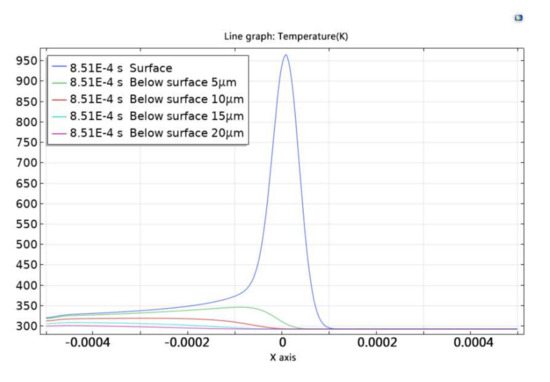 Paint removal using laser technology is a complex process. Laser beams are used to work on the paint layer with photons as the energy carrier. The photons transfer energy to the surface of the paint layer, causing a series of physical and chemical changes. The paint layer absorbs most of the laser energy, activating and converting the molecules or atomic groups in the paint to thermal energy. Instantaneous expansion and vaporization, among other processes, occur on the surface of the paint. In this experiment, the photon energy of the fiber laser with wavelength of 1064 nm was found to be 1.16 eV. The laser energy absorbed by the paint surface is transmitted and accumulated in the paint. The area closest to the laser beam’s focus shows the fastest response and a rapid rise in temperature. Figure 14 shows the temperature change curves at different depths in the x-axis direction at t = 0.000851 s. The temperature of the paint layer was found to decrease rapidly with increase in depth, as shown in Figure 14. Compared with the temperature of the paint surface, the temperature below surface 5 μm was lower than 600 °C.