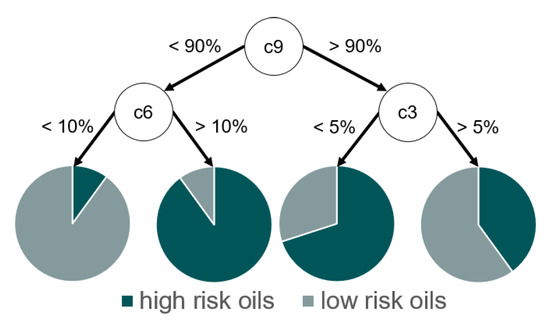 - Number of tried features at each split (from here on referred to as ftry): the number of randomly selected candidate variables, in this case compound IDs, for each split in a given decision tree in the RF when growing it. A split in a decision tree is every point when a given oil either follows a right or left path. For example, in Figure 1, the first split is performed according to the percentage of c9 in the oil. If two variables are tried with an ftry = 2, then the variable that best splits high and low risk oil compositions is selected. For example, if c1 and c2 are tried and c1 results in a split with the right side of the split containing only high risk oils and the left side containing only low risk oils, and c2 results in a mixture of high and low risk oils on both sides of the split, then c1 is chosen. This is because the split according to the percentage of c1 in the oils, in this example, results in a purer separation of high and low risk oils compared to c2. If ftry is equal to 3, then three compound IDs are instead evaluated at each split. Similar to sample size, decreasing ftry results in worse performance by the individual trees, but increasing it can result in overfitting. Much like the case with sample size, the right balance needs to be found where the highest performance by the RF is reached.