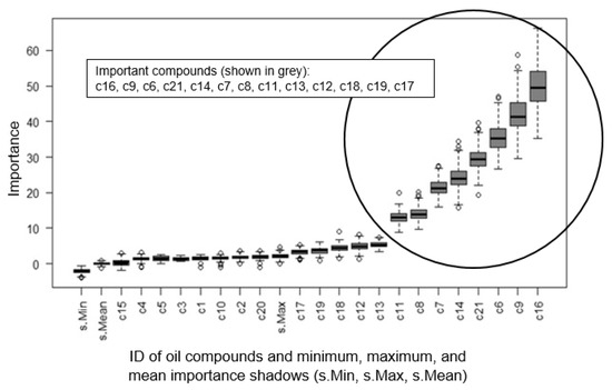 - Node size: the minimum number of oils in a terminal node of any tree in the RF. Without going into more details, the typically used value for classification problems is 1, which was the value chosen for developing the RF in this investigation since it generally provides good results [32]. When attempted, increasing the node size did not lead to higher accuracy.