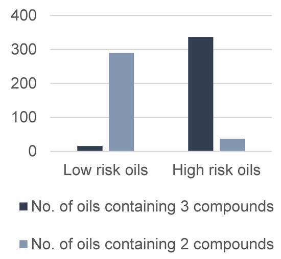 - Count: the number of oils in the dataset that contain all the compounds in a given association rule. Using rule number 2 from Table 3 as an example, the count is 9, which means that the number of oils in the dataset that contain the combination of c8, c9, and c12 is 9.