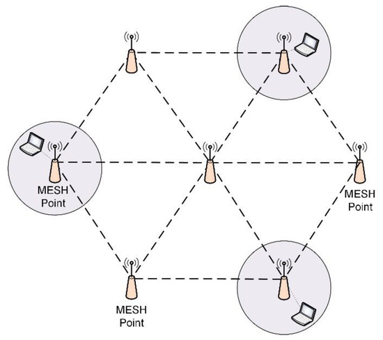 The rapid development of mobile services and the significant increase in the number of mobile devices makes it necessary to provide more and more novel solutions in terms of reliability and performance of wireless network structures. MESH networks are one of the types of these structures [16,40]. These networks constitute a wireless communication infrastructure between distributed network nodes. These nodes can be installed wherever power infrastructure is provided. These structures are frequently used in ad hoc type solutions, which are perceived as cheap and energy-saving nodes. As technology advances, they are becoming more and more miniaturized and efficient. The essence of this type of network is to provide direct, non-hierarchical communication between as many nodes as possible. Therefore, the main idea of MESH wireless networks is based on the appropriate physical topology, as various techniques can be used in the area of logical topology—switching, routing, load balancing, etc.