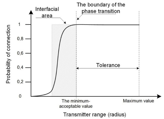 Before implementing the analysis of phase transformations in topological structures, one should present a definition of a phase; i.e., a uniform part of the physical system, separated from others by interphases, called phase boundaries, on which a step change of physical or chemical properties takes place [43,44]. Taking into account the structure of physical topology in wireless networks, the phase transition border shown in Figure 3 also indicates that even a small reduction in the transmitter’s range (exceeding this limit to the left) may cause major changes in the structure of network connections. In an extremely critical situation, as even a slight crossing of this limit may result in a loss of cohesion, and hence the breakdown of communication connections. However, in many cases, this limit is the beginning of the so-called interfacial area; i.e., the area in which the probability of a connection between neighboring nodes decreases (below the value of 1). It should be remembered that change in the value of such parameters as transmission range, number of nodes, and their location, does not necessarily result in a change in the probability value of ensuring network connectivity (which will be demonstrated later in the work). In this case, despite maintaining the connection, there may be significant degradation of the connection quality, which is associated with the loss of packets, large delays, etc.