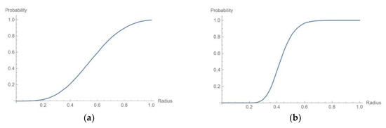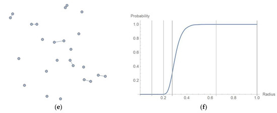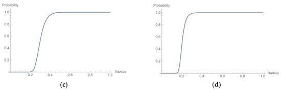 The simulations carried out indicate that as the radius value decreases, the number of available connections decreases. In addition, with a smaller number of nodes, there is a higher probability that the number of available connections will be significantly reduced with a relatively small change in the radius value. This dependence is shown in Figure 6 (for the purposes of the paper, this chart will be referred to as PTC; phase transition chart), which shows the relationship between the probability of connection and the radius value. These charts confirm previous observations. Thus, a smaller number of nodes causes a faster phase change (see Figure 6a), while the interface is much wider. However, in the case of a large number of nodes, e.g., 60 (see Figure 6d), the probability of providing connections (p = 1) is much larger and the interphase is relatively narrow. Thus, the dynamics of the phase change process in the interfacial area is much larger, and a small change in the transmitter’s power allows the meaning to reach the stability/consistency of the topology faster.