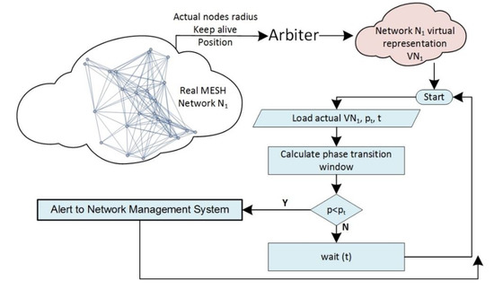 One of the basic areas of active management of a distributed computer system is the ongoing analysis of the consistency of communication network. It is particularly important from the perspective of dynamic structures based on radio communication for Industry 4.0 and IoT systems. One of the main pillars for the development of production lines designed in the spirit of industry 4.0 is the use of in-depth sensory diagnostics. For economic reasons, it is not possible to replace existing manufacturing components (machines) with new ones equipped with the desired sensors. One of the proposed solutions is the use of additional sensors placed on crucial elements of the machines that transfer data to the control system, anomaly detection, etc. Such a solution was proposed, e.g., in the paper [45], where the authors present the use of high-sensitivity LiNbO3 vibration sensors for robotic arm monitoring. The MESH network was built to create a communication layer for the sensors. The possibilities of using MESH networks to connect IoT elements are obviously much wider and their use is practically unlimited, especially for data collection networks. Some of the industrially-used solutions use battery-powered MESH infrastructure elements. Their lifetime is limited, but a failure of one of the network elements does not cause its inconsistency. The node coherence of such networks is usually many times higher than 2. In order to manage such networks properly, it is necessary to develop a method for estimating the current network integrity. Of course, measures such as graph coherence or connectivity (understood as the ratio of the edges available in the topology being analyzed to the number of edges in the corresponding complete graph) can be used. However, their use does not determine the probability of loss of consistency in a holistic approach, but is rather used to determine whether the network is working or not. To assess the current ability to provide network communication, the authors proposed architecture and an algorithm based on the phase transition analysis discussed earlier. The system architecture is presented in Figure 8.