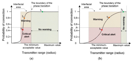 At the moment t1 (Figure 9a), the operating parameters of the system (available number of nodes, their location, and range of transmission) ensure the possibility of maintaining full coherence in the network; i.e., making connections with probability of p = 1. Let us assume that the power of transmitters is reduced as a result of system operation due to the depleted node batteries. As a result, the probability is p = 0.8 at t2. In this case, the system generates a warning message to the network management system (NMS) system, informing it about deteriorating network reliability. If the power of the transmitters decreases further at the time of t3, the system sends a message about the critical state of the network and the need to take immediate action (e.g., the need to replace the battery). It should be noted that the arbiter is connected both to the MESH network structure using a wireless network and uses a reliable connection (GSM, cable connection, etc.) to the network management system (NMS). The question of how to replace the battery can be implemented in many ways, e.g., by technical staff. A separate issue, discussed later in this article, is how to set the parameter value pt. The second case is considered here (Figure 9b). Compared to the first case, the number of available network nodes dropped as a result of failure directly affecting the shape of the PTC curve. The way the curve shape changes for the interfacial area depending on the number of nodes is presented for sample networks in Figure 6. To maintain consistency, nodes must increase the transmission range. As a result of these events, the network becomes very sensitive to power drops (a very small “green” area on the PTC chart) of transmitters and requires relatively much energy for proper operation. In such a situation, the arbiter quickly reports warning (t4) messages and corrective action will be required. The probability limit pt can be determined experimentally during system operation. Correct timing is crucial because of the system operation costs. During the interviews with a group of entrepreneurs, the following aspects were identified related to the correct selection of time: