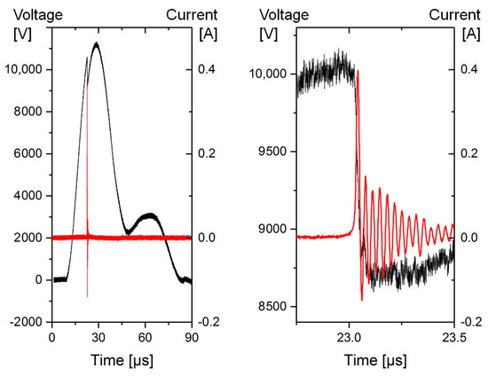 Depiction of the applied voltage pulse shape (black) and the resulting current impulse (red) on the example of the positive pulse. Here, the formation of the plasma occurs on the rising edge of the voltage pulse, leading to a short-term voltage drop and a quick increase of the discharge current.