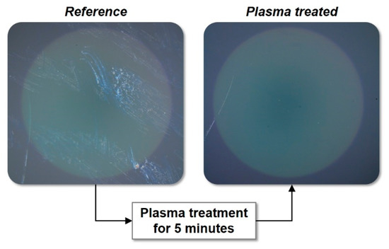 It is well known that atmospheric pressure plasmas are efficient tools for cleaning glass surfaces by the removal of organic contaminations as demonstrated by various authors in the past [24,42,43,44,45]. The high potential of this technique was also observed in the present case. As shown in Figure 3, even persistent fingermarks can be removed from polished lens surfaces. Here, a quite long-term plasma treatment as described in Section 2.2 was performed for 5 min in order to visualise its remarkable impact on such severe surface contamination.