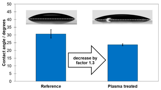 Impact of plasma treatment of 10 s on the contact angle of UV-curable optical cement (error bars represent standard deviation of five measurements).