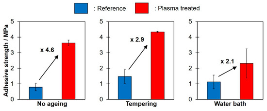 Comparison of the particular adhesive pull strengths of non-treated reference and plasma treated (for 10 s) samples after different storing procedures as described in detail in Table 1 (error bars represent standard deviation of five measurements).