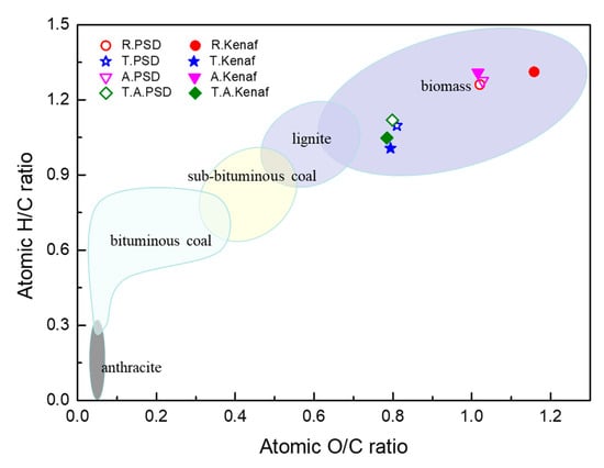 R. Kenaf had the highest H/C and O/C values, which indicated that it contained the biomass of the lowest quality. In case of kenaf, the ashless process led to improved elemental composition, resulting in A. Kenaf being similar to existing R. PSD. However, A. Kenaf and T.A. Kenaf had lower values compared to A. PSD and T. A PSD. This suggests that when Kenaf is pretreated, carbonization can be active unlike that in pretreated PSD.