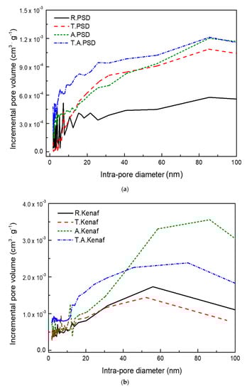 Figure 2 shows that the pore size distributions at all regions using the BET method were based on the results of nitrogen sorption analyses of PSD samples and Kenaf samples after grinding. The porous structures are divided according to the pore diameter into micropores (those with a diameter <2 nm), mesopores (diameters 2–50 nm), and macropores (diameters >50 nm) [24]. Table 2 shows the quantitative values for pore volume and surface area for PSD samples and Kenaf samples divided by the pore diameter based on the BET results.