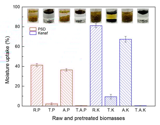 Kenaf has higher hygroscopicity when compared with PSD and there is a general trend for the reduction of absorbed moisture content after torrefaction for both PSD and Kenaf (Figure 4). Both R. PSD and R. Kenaf experienced the highest uptake of water during the two hours of immersion (41% and 81%, respectively) and uptake of water for R. Kenaf was higher than that of R. PSD, while A. PSD and A. Kenaf absorbed considerably lesser water than that of raw samples (36% and 67%, respectively). After torrefaction of raw samples, the uptake of water was much lower (2% and 9%, respectively) and torrefied; further, ashless samples absorbed the least amount of water (approximately 0%). These findings proved that torrefaction improved the hydrophobicity of both woody and herbaceous biomass. This type of torrefaction impact was in agreement with results of Chen et al. [26]. Water is absorbed by the woody materials owing to the presence of hydroxyl groups (–OH) that attract and hold water molecules through hydrogen bonding. In wood materials, hemicelluloses are more hydrophilic than cellulose and lignin. Hemicelluloses and the noncrystalline region of cellulose chains can attract water easily, owing to the availability of hydroxyl groups [27]. The carboxylic acid groups (–COOH) in hemicelluloses are also active in absorbing water [28]. However, the degradation of hemicelluloses and amorphous cellulose by torrefaction results in the removal of –OH and –COOH groups and further decreases hydrogen bonding with water. As a result, tar condenses inside the pores, thereby obstructing the passage of moist air through the solid, avoiding water vapor condensation. The polar character of condensed tar on the solid also prevents the condensation of water vapor inside the pores [29].