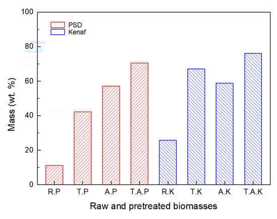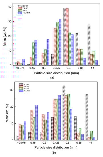 The particle size distribution of PSD and Kenaf showed a high distribution in region of 0.6–0.425 mm and 0.85–0.6 mm (Figure 5). Among them, the largest particle size distribution of 1.0–1.18 mm or more had a large distribution of R. PSD and R. Kenaf, as well as a smaller distribution of T. PSD, A. PSD, and T. A PSD. As the torrefaction process, the smaller particle distribution is higher. This is indicated that torrefaction lead to improved grindability as shown in the torrefaction of Kenaf samples. This trend is consistent with those reported in similar studies investigating the grinding of torrefied biomass [30]. This indicates that during torrefaction, continuous decomposition of hemicellulose causes weakening and destruction of the highly interlinked cellulose–hemicellulose matrix, which no longer can support the cellulose fibers [31]. In addition, T. Kenaf, A. Kenaf, and T. A Kenaf are mainly distributed in areas below the smallest size distribution (0.15–0.075 mm). Thus, kenaf shows a smaller size distribution than that of PSD when samples are pretreated.