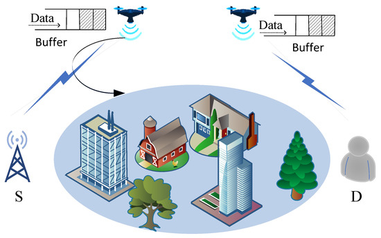 Studies have shown that the buffer aided relaying technique can effectively solve the adverse effects brought by time varying channels. It enables relays to have the ability of data storage, breaks through the traditional transmission mode, and flexibly uses the best channel [7,8]. Therefore, in this paper, it is considered that all UAV relays are equipped with a buffer and employed in delay tolerant applications [4]. Benefiting from both relay node mobility and buffer aided relaying, UAV relays equipped with a buffer can store and forward the information under more favorable conditions when certain quality-of-service (QoS) requirements are satisfied.