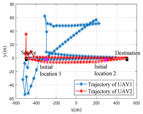 Figure 2 shows the UAVs optimization trajectories by the proposed algorithm for flight period T = 60 s. The initial locations of UAVs and ground nodes are marked with purple “” and black “”, respectively. In this figure, the asterisk indicates that the location of the UAV is sampled at every 0.5 s. The initial and final location of all UAVs satisfied a feasible constraint in (1), and all UAVs satisfied the minimum safety distance to avoid collision. From this figure, we can see the two UAVs tried to get close to their served ground nodes during every time slot under the flying constraints. Because the UAVs served the source or destination in different time slots, sometimes the trajectories of UAV1 and UAV2 may be a straight line from the source to the destination node.