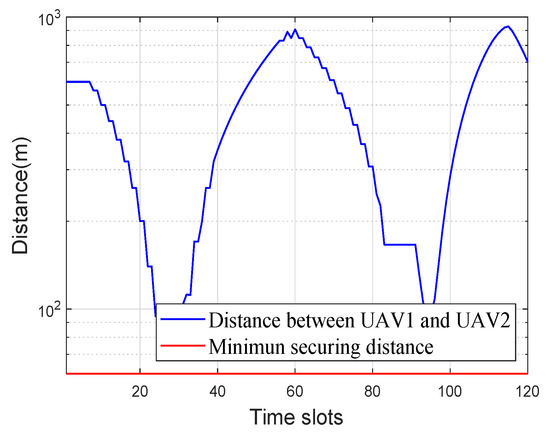 Then, in Figure 3, the flight security of the proposed algorithm is demonstrated for period time T = 60 s. It can be obviously observed that the distance between the two UAVs varied with time and always exceeded the minimum security distance. Therefore, the trajectories of the two UAVs satisfied the collision avoidance constraints in every time slot.