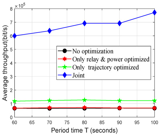 First, as expected, the average throughput could be increased by optimizing any variable (relay selection and transmit power and/or flight trajectory). Second, it is observed that the joint optimization algorithm we proposed could greatly increase the average throughput in comparison with optimizing a single variable. The results above further demonstrated that the trajectory optimization was more effective than optimizing relay selection and transmit power. Finally, it was found that the average throughput could be improved as the flight period increased with the joint optimization algorithm. In a word, the proposed algorithm could significantly improve the system performance in terms of throughput.