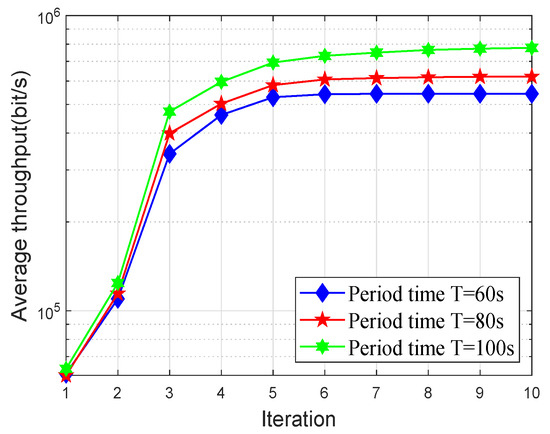 Next, we demonstrate the convergence behavior of Algorithm 1 in Figure 5. The average throughput of this network during different periods is illustrated. From this figure, it can be observed that with the number of iterations of the proposed algorithm increasing, the average throughput of this network gradually converged, and the convergence was achieved at about six iterations. Therefore, the curves satisfied our expectation and verified the effectiveness of the proposed algorithm in maximizing average throughput. Furthermore, it can be found that the system average throughput could be increased by prolonging the period time.