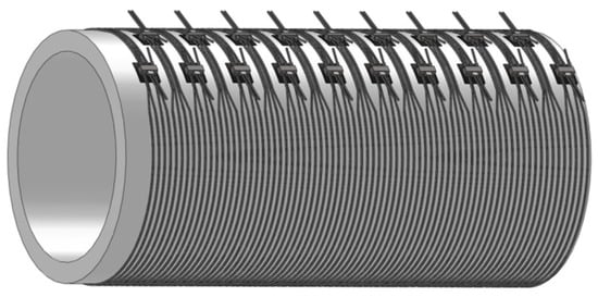 The reinforcement of a PCCP with external prestressed steel strands involves repairing critical pipes with additional external post-tensioning to increase the longevity of problematic PCCP pipelines. The strands are wrapped outside the pipe with a fixed spacing between each strand, according to the service water pressure [] (Figure 1). A well-known large-scale application of external prestressed strands is in the Great Man-Made River pipelines in Libya []. Most of the pipes in this project have an internal diameter of 4.20 m. Authorities have determined that repair of the critical pipes should proceed, with additional external post-tensioning in areas where pipes had burst. The reinforcement of the external prestressed strands on PCCPs has proven to be effective here. This approach is advantageous due to its ability for construction to proceed with no need to drain the pipeline. However, few theoretical studies have been carried out regarding the prestress losses and the mechanism applying external prestressed strands to strengthen PCCPs.