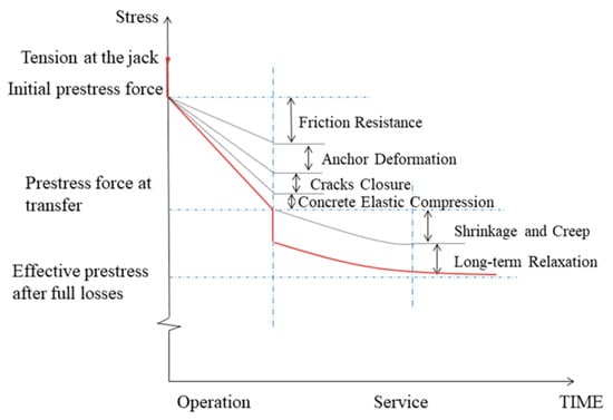 The prestress loss persisted during and after the tensioning operation, and can be divided into two categories, namely, instantaneous loss and long-term loss [,,]. Instantaneous loss, i.e., short-term loss during the tensioning operation, described the prestress losses caused by friction resistance between the surface of the pipe wall and the steel strands, the anchor deformation, the concrete elastic compression induced by stepwise tensioning operation, and cracks closures. Long-term prestress losses included prestress losses [,], while taking into account the materials aging, including the effects of shrinkage and the creep losses of concrete, and the long-term relaxation losses of prestressed steel strands. Types of prestress loss of steel strands applied to PCCPs are illustrated in Figure 2. Since the reinforcement of PCCPs with external prestressed steel strands is a post-tensioning method, the impact of temperature can be removed from consideration when considering the reinforcement of PCCPs with external prestressed steel strands.