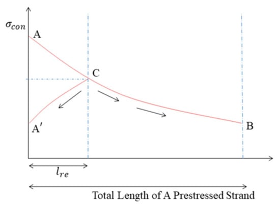 As far as we know, the stress distribution along the strand is nonlinear. The anchor influenced the prestressed steel strand within a certain length range due to the static friction caused by the retraction of the strand. This length is called the retraction length, . Strands within the retraction length showed a displacement opposite to the tension direction, which decreases the prestress. The movement trend is demarcated at point C, and the stress is redistributed from ACB to (Figure 3).