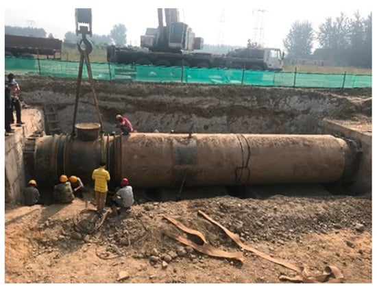 In order to verify the feasibility of the deduction, an example calculation of the theory and a prototype test were carried out on the same PCCP with broken wires. The specimen was an embedded prestressed concrete cylinder pipe (ECP) and the calculation process used is illustrated in Section 3.2. The center spacing of steel strands, calculated through the deduction, was then applied to the same pipe in a prototype test (Section 3.3).