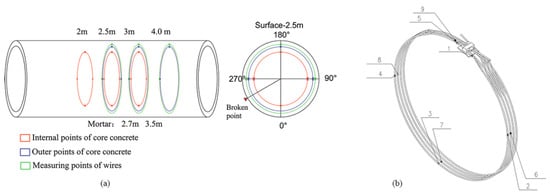 Layout of measuring points of (a) the pipe and (b) the steel strands.