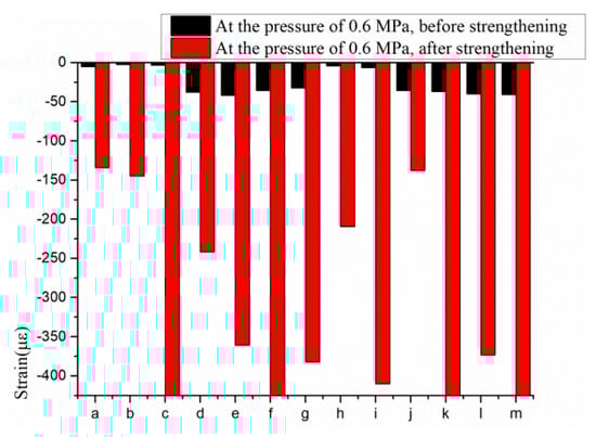 Comparison of strains in core concrete before and after the reinforcement: (a) 2.5 m inner concrete core at 0°; (b) 2.5 m inner concrete core at 90°; (c) 2.5 m inner concrete core at 180°; (d) 3 m inner concrete core at 0°; (e) 3 m inner concrete core at 90°; (f) 3 m inner concrete core at 180°; (g) 3 m inner concrete core at 270°; (h) 2.5 m outer concrete core at 0°; (i) 2.5 m outer concrete core at 90°; (j) 3 m outer concrete core at 90°; (k) 3 m outer concrete core at 180°; (l) 4 m outer concrete core at 90°; (m) 4 m outer concrete core at 180°.