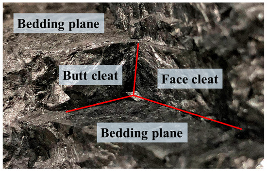According to existing research, many natural cleats and joints exist in coal seams [29,30]. These cleats and joints are vertically distributed in the coal seam and form a stereo network [31,32], as shown in Figure 1. According to the microscopic damage mechanics theory of micro-cracks, the continuous impact of the water jet on the coal rock causes stress concentration and crack initiation around the cleat tip in the coal. In the case of a fixed nozzle, the optimization of the water jet impact direction and pump pressure can affect the stress concentration around the cleats and joints. Then the cleats and joints will be initiated and stimulate the permeability. In hydraulic slotting, the water jet direction is perpendicular to the borehole; therefore, the water jet direction can be optimized by optimizing the borehole angle. Because the initiation of the cleat tip cannot be monitored experimentally, a numerical simulation was carried out for analysis. We investigated the pump pressure and transverse speed by carrying out the experimental testing described in the next section.