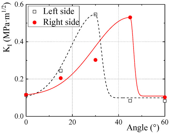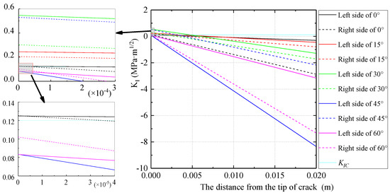 To further investigate the cleat initiation, the KI values at different points close to the cleat tip were calculated using Equation (2). The KI values of the cleat tip at different included angles were obtained using the least squares method to fit KI and obtain the regression line. The KI fitting results for the cleats tips with different included angles are presented in Figure 4, and the KI values at the tips are shown in Figure 5. As can be seen, the KI values at both tips of the 0°, 15°, and 30° models exceeded the fracture toughness of the coal, and cleats were initiated from both cleat tips. In the 45° model, only the KI value of the right tip exceeded the fracture toughness, and the cleat initiated from the right tip. Because the KI values at both tips of the 60° model did not exceed the fracture toughness of coal, the cleat did not initiate.